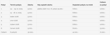 | Celkem | 6 pobytů | 30.000,- | 41.000,- | 71.000,- |